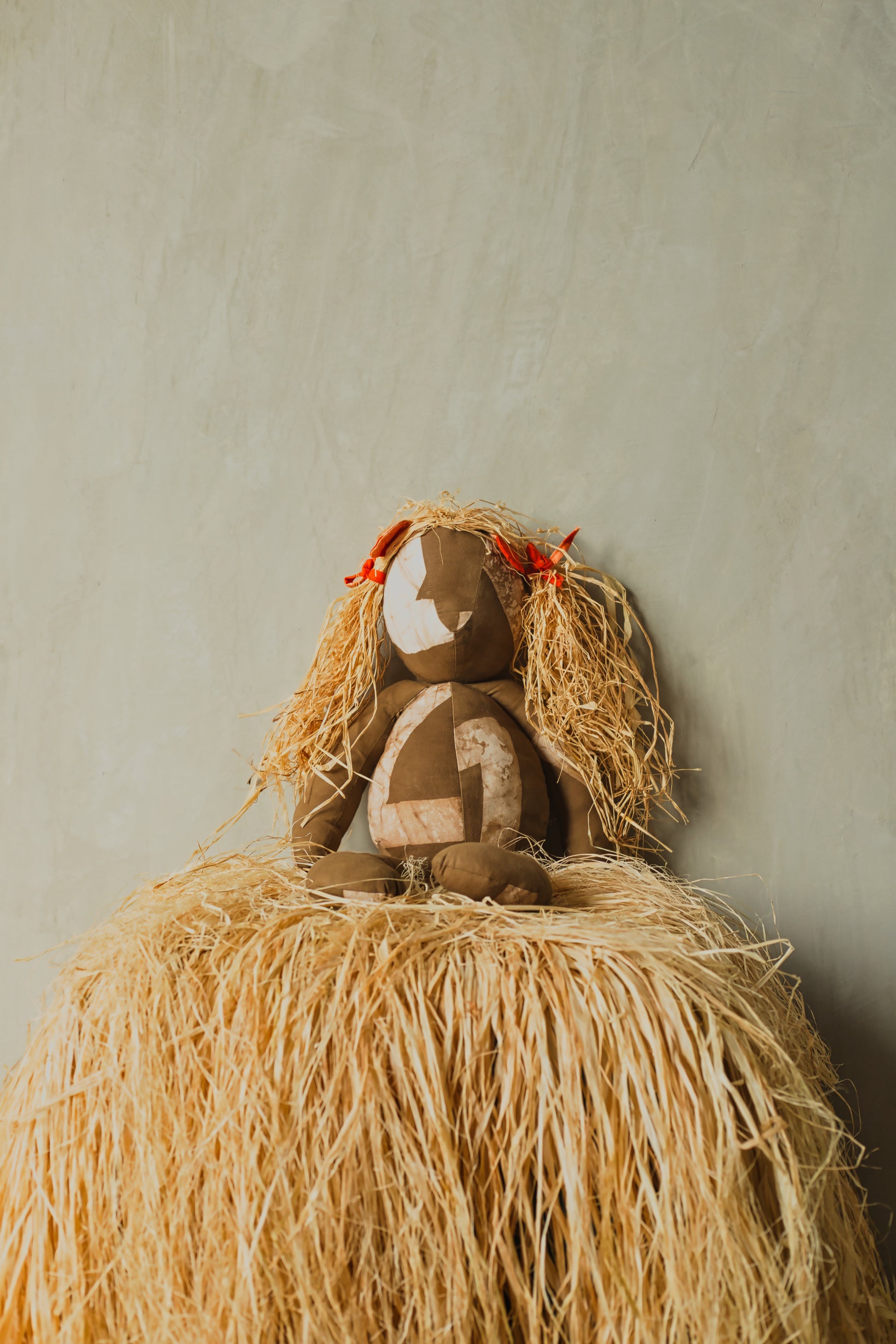 What makes her truly unique? Her beautiful hair—crafted from natural raffia—adds a rustic, whimsical touch. The textured strands are tied into playful pigtails or flowing braids, giving her a character all her own.