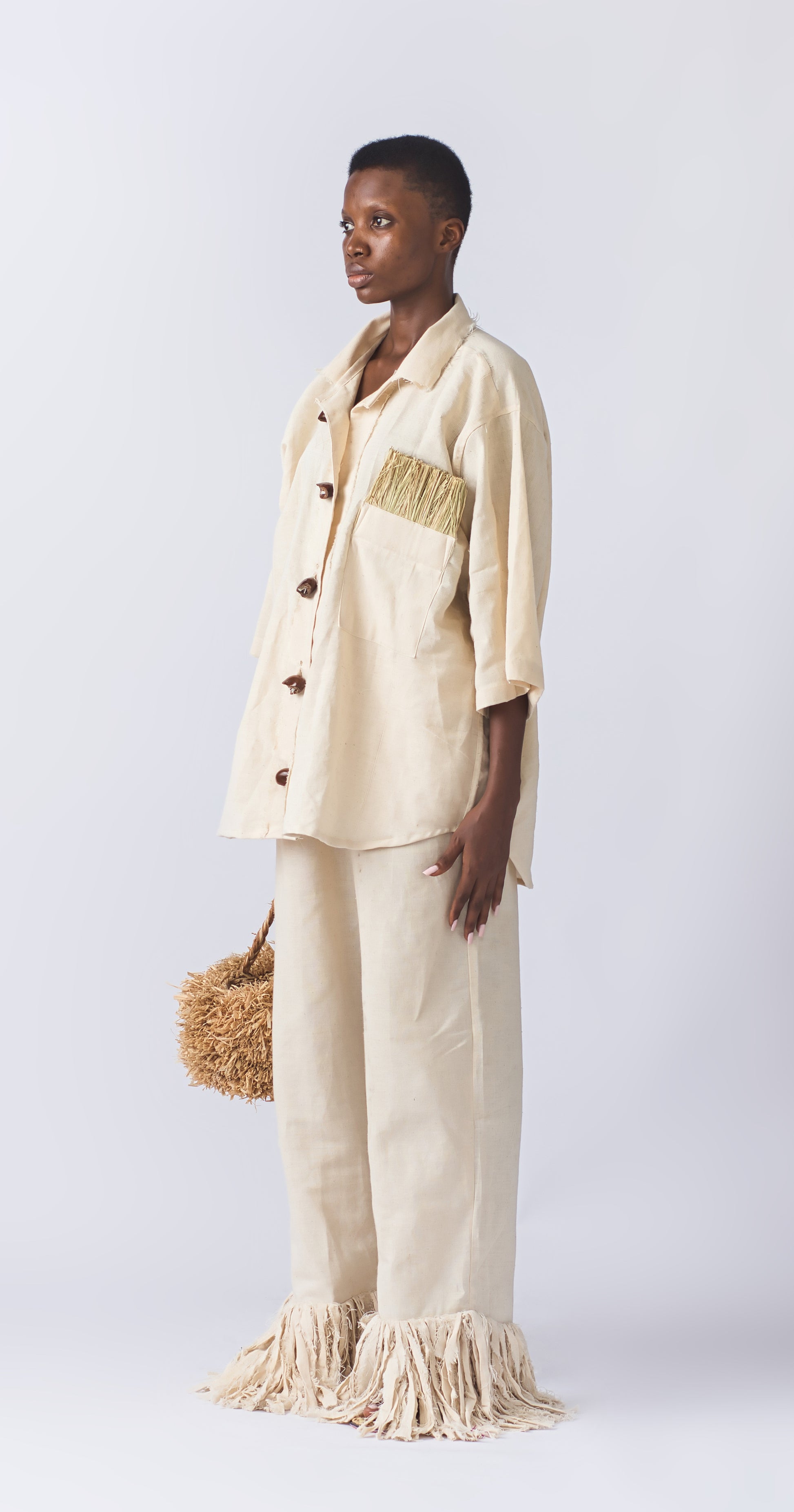 Embrace the natural beauty of our Earthy Raffia Shirt, crafted from unbleached cotton fabric and featuring unique raffia pocket details. This shirt combines sustainable materials, traditional craftsmanship, and effortless style.