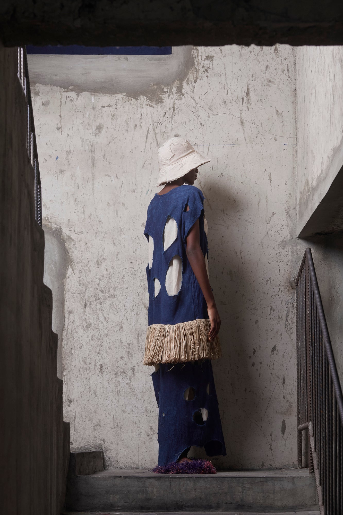Hand-dyed in natural indigo, the Indigo Memory Dress explores textile as archive. Cut in a relaxed silhouette, the dress features deliberate cut-out detailing that reveals layered contrast beneath — a quiet play between exposure and protection.