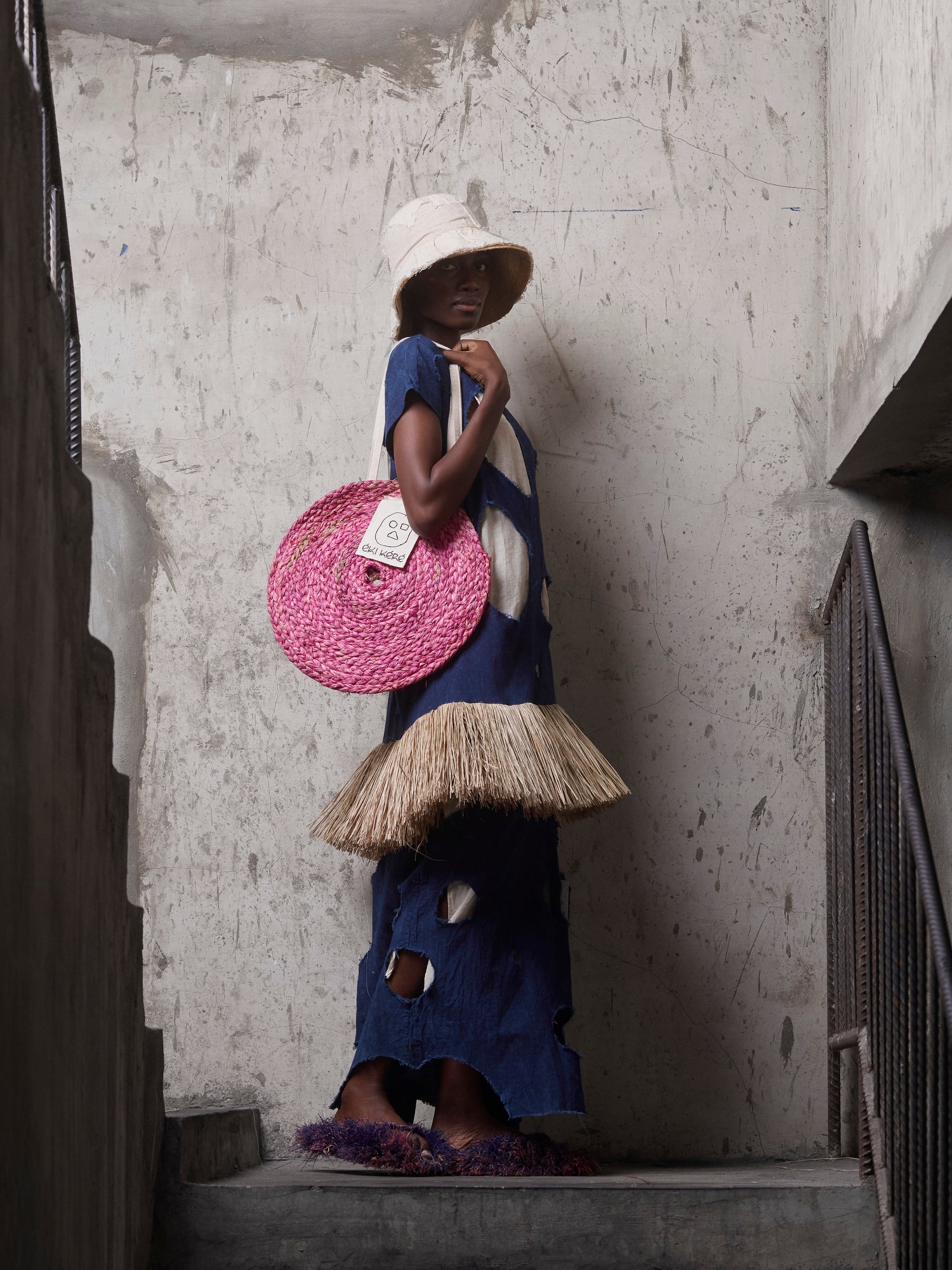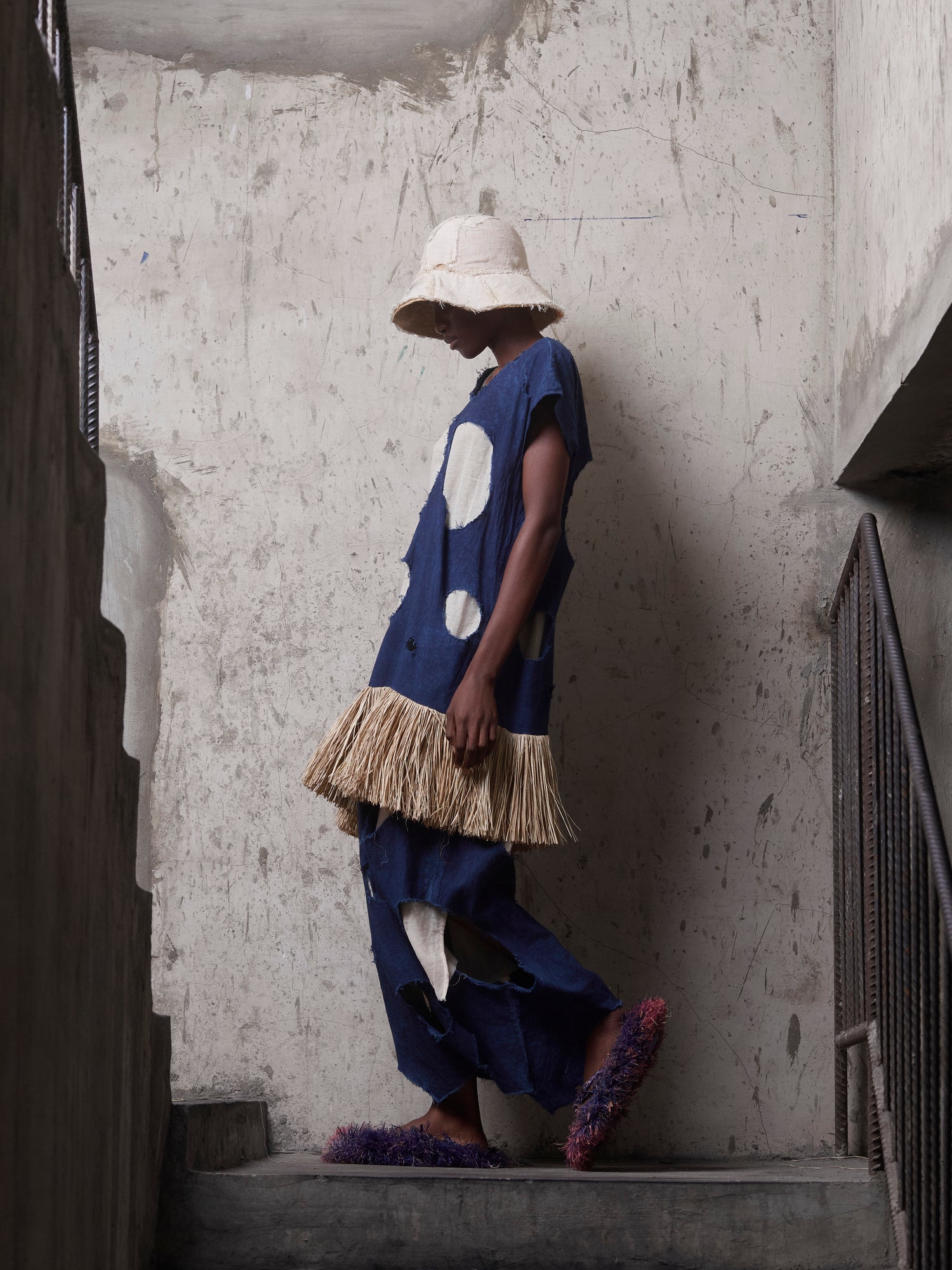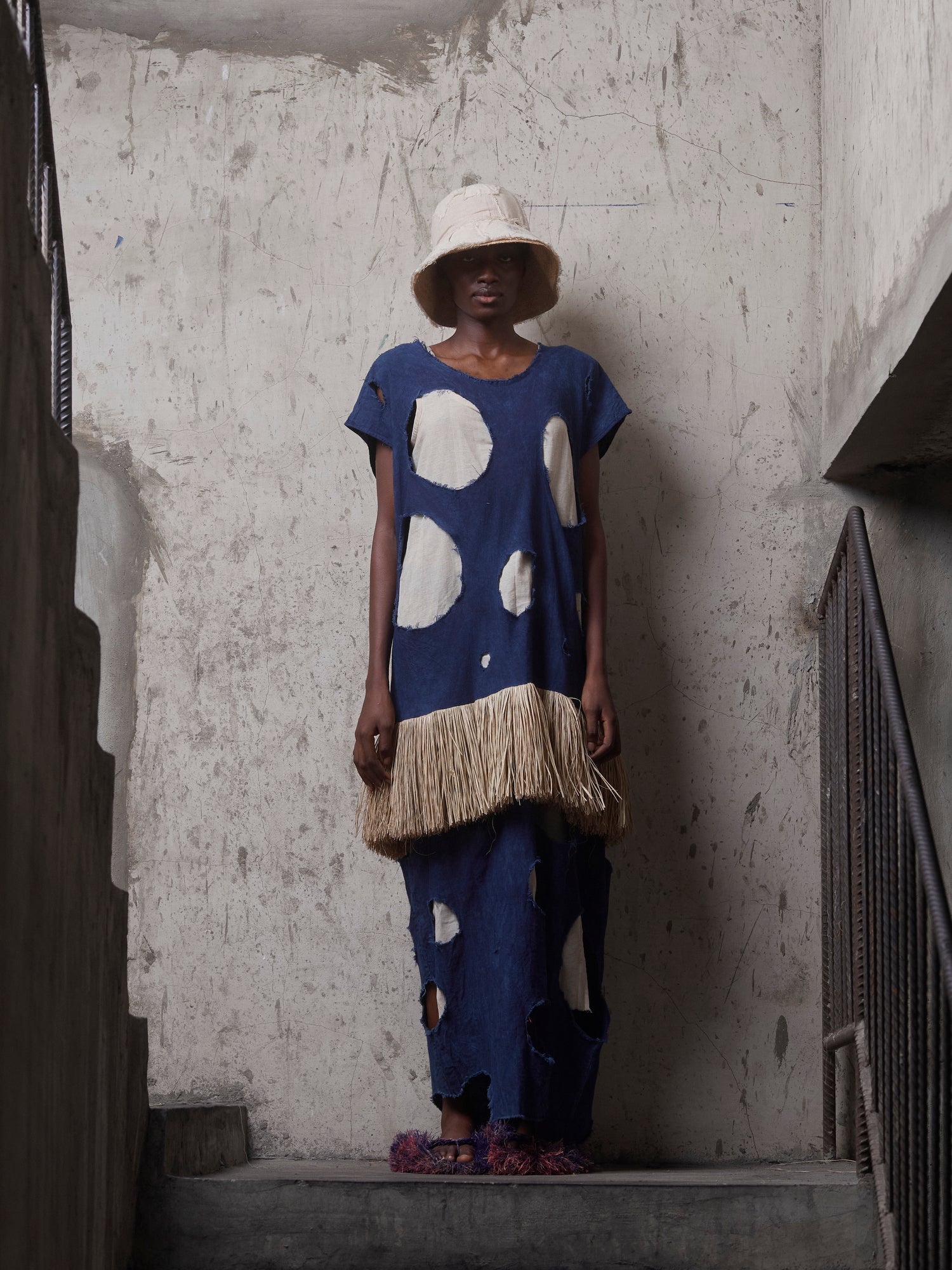 Finished with hand-applied raffia trim along the hem, the piece carries tactile references to craft traditions and ceremonial adornment. Each dress is individually dyed, making subtle variations part of its story.