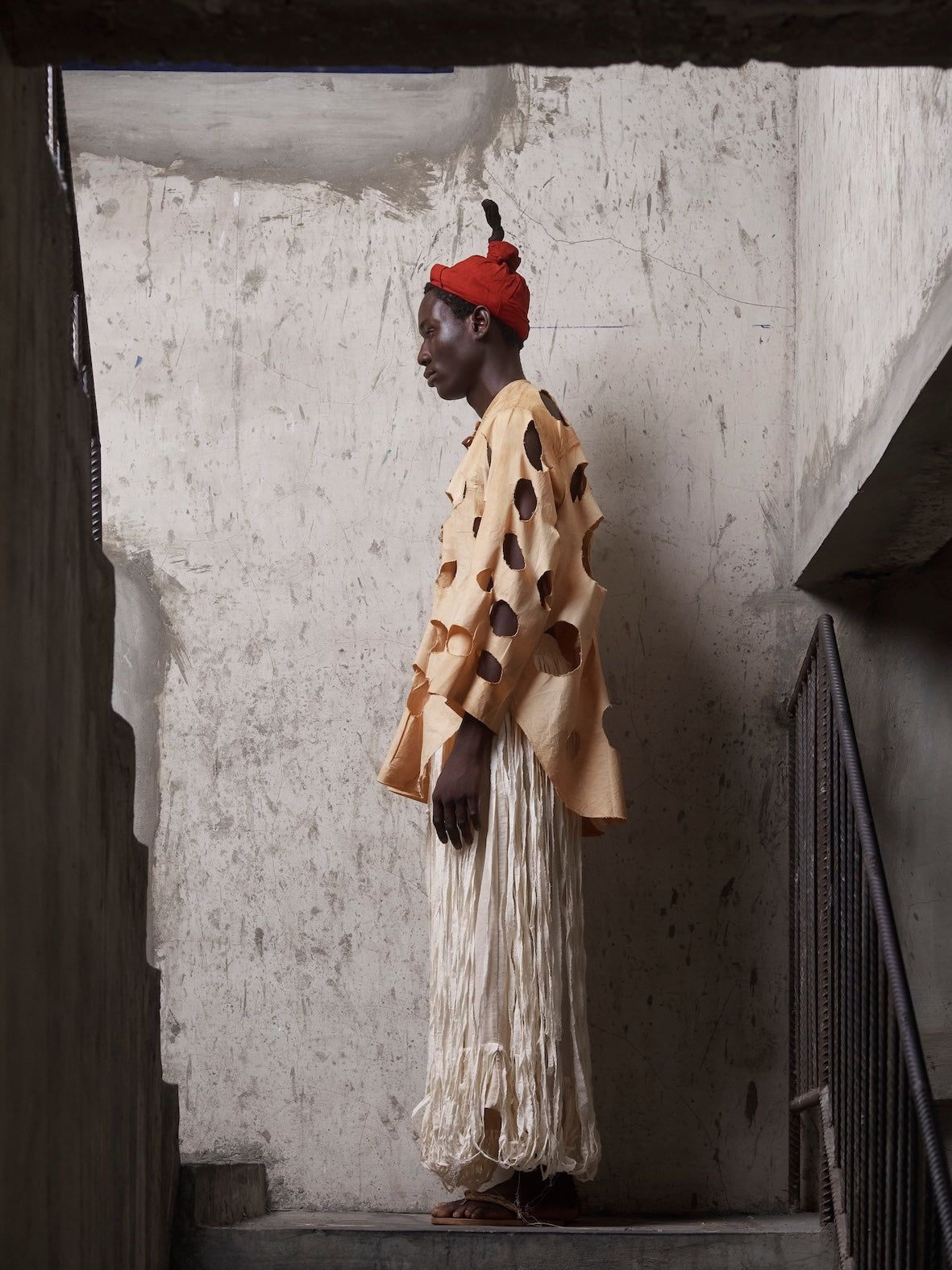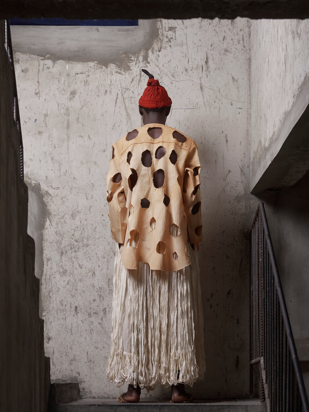 A relaxed tunic made from 100% cotton and naturally dyed with kola nut to achieve its warm, earthy tone. The fabric features hand-cut perforations that introduce texture, breathability, and subtle layering possibilities. Raffia fastenings at the front add an artisanal finish, balancing craft tradition with a contemporary silhouette. Each piece is dyed in small batches, making every tunic slightly unique.