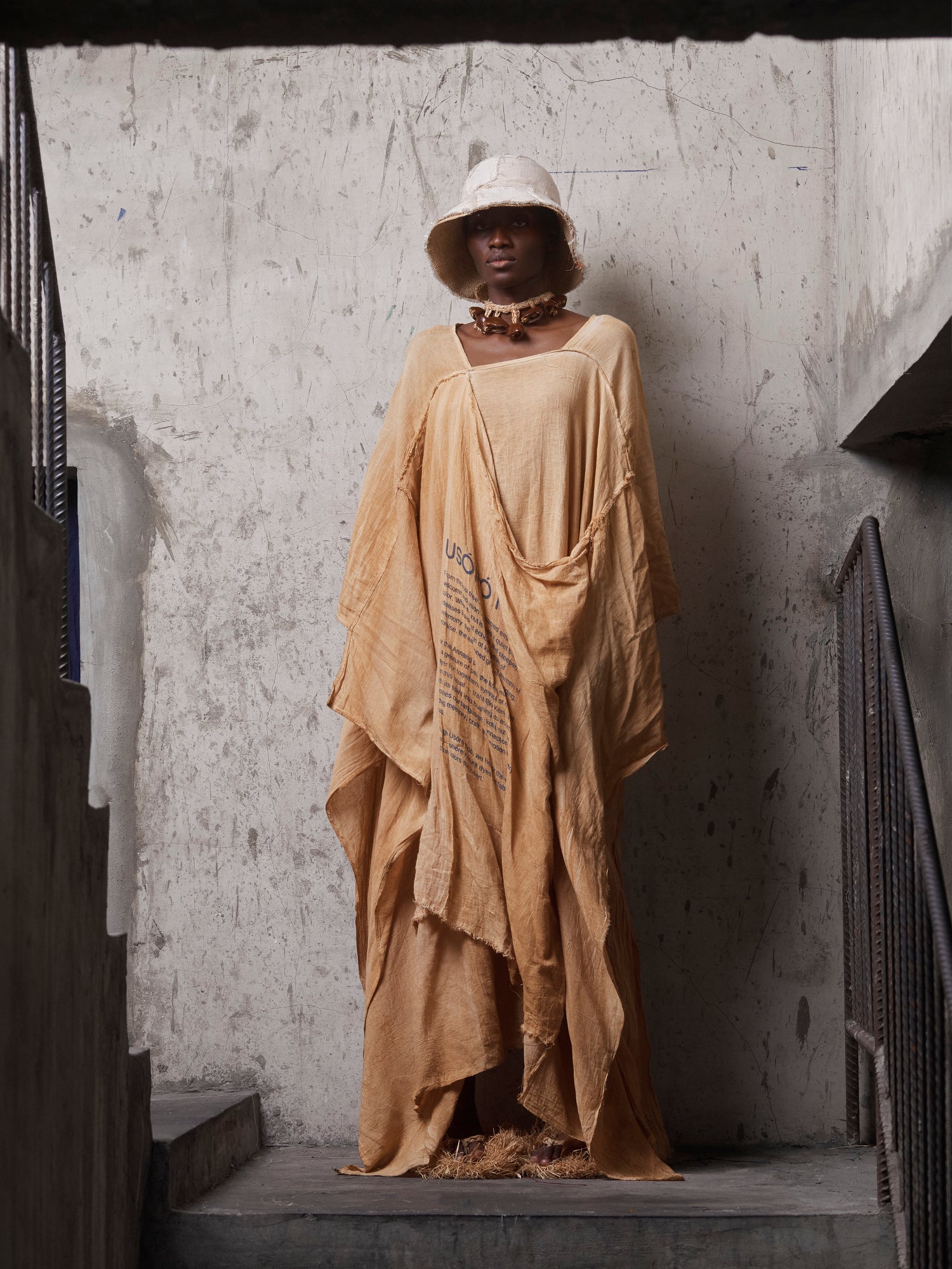 Crafted from 100% breathable cotton and naturally dyed with kolanut, the Usóró Ndó Kaftan is a quiet statement of ease, ritual, and form. Designed with a fluid drape and soft structure, it moves gently with the body while holding space for meaning—subtle text detailing and hand-finished edges speak to ceremony, memory, and intention.