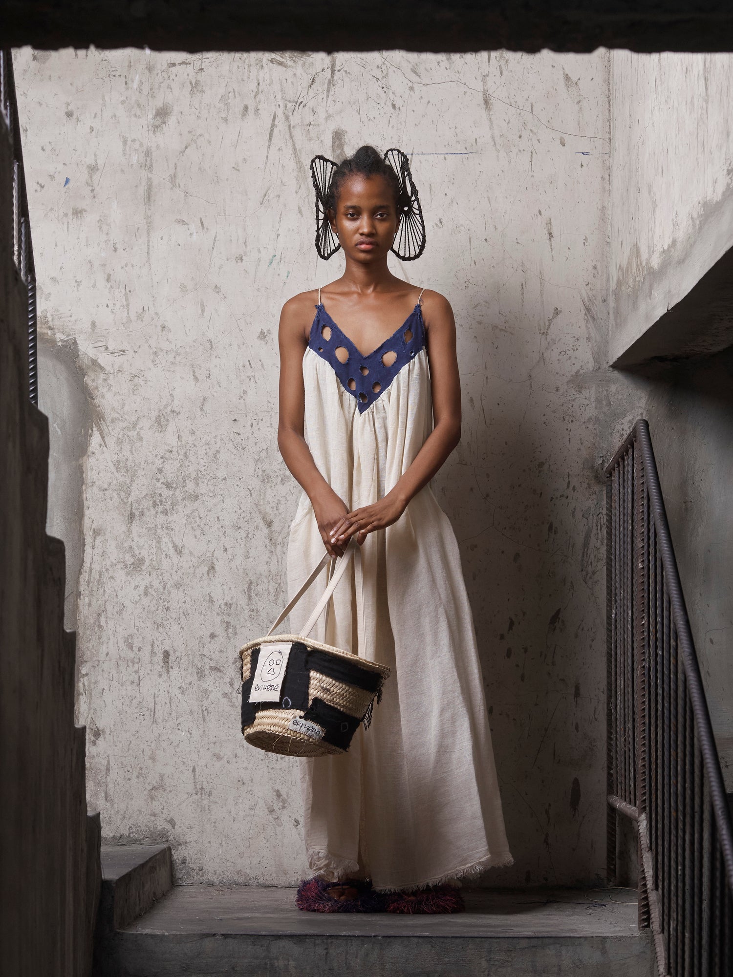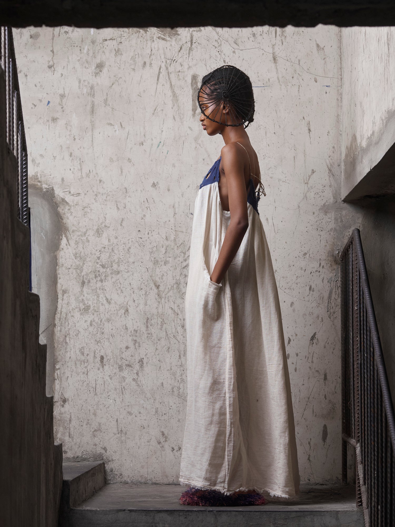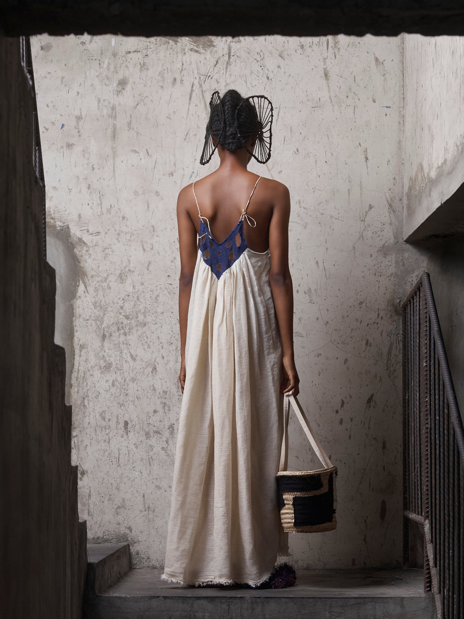 Made from 100% cotton, this flowing Usóró Ndó dress balances softness with intention. The relaxed silhouette is framed by a hand-cut, indigo-dyed cotton yoke, punctuated with organic cutwork that echoes breath, openness, and ritual.