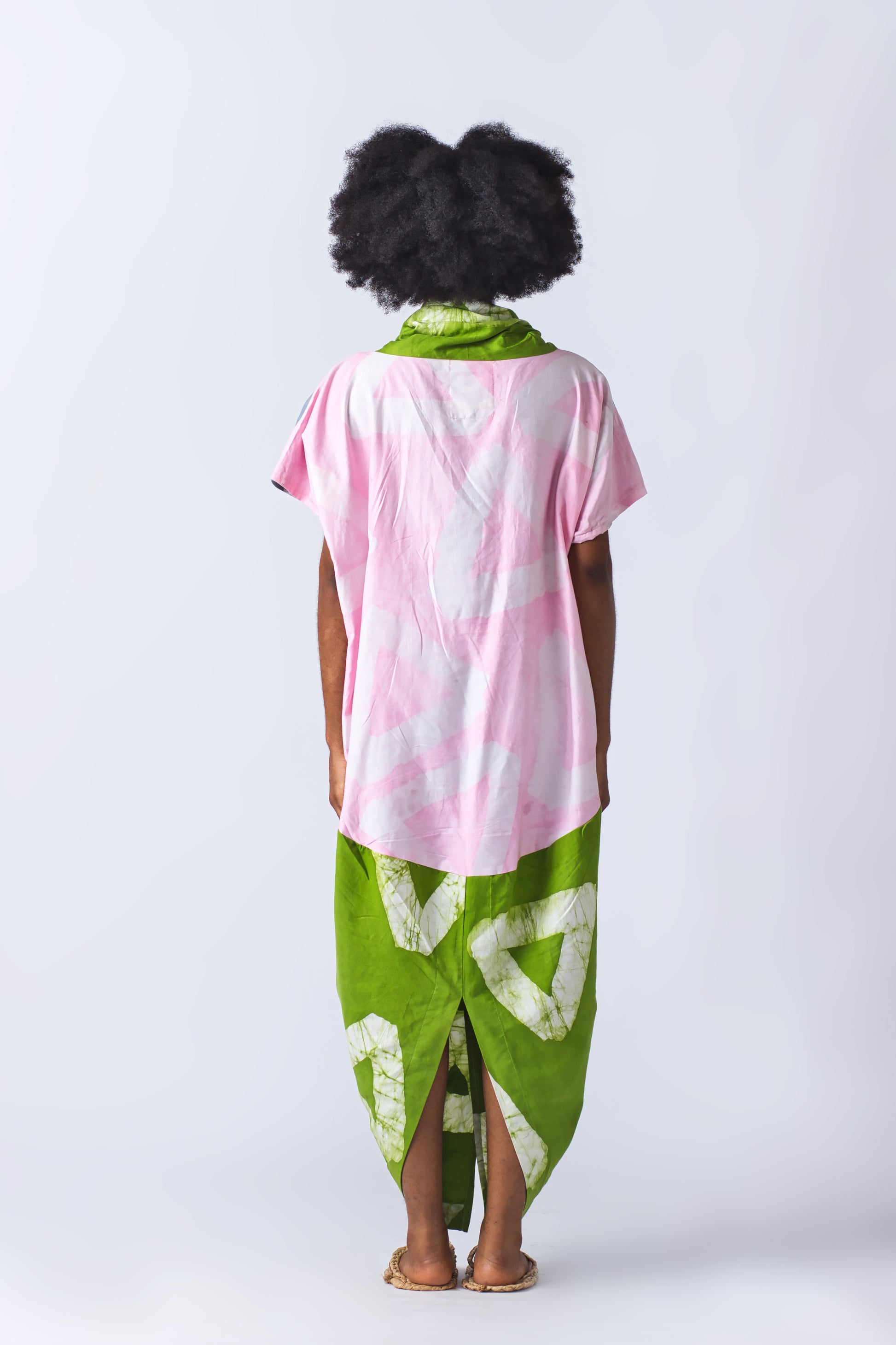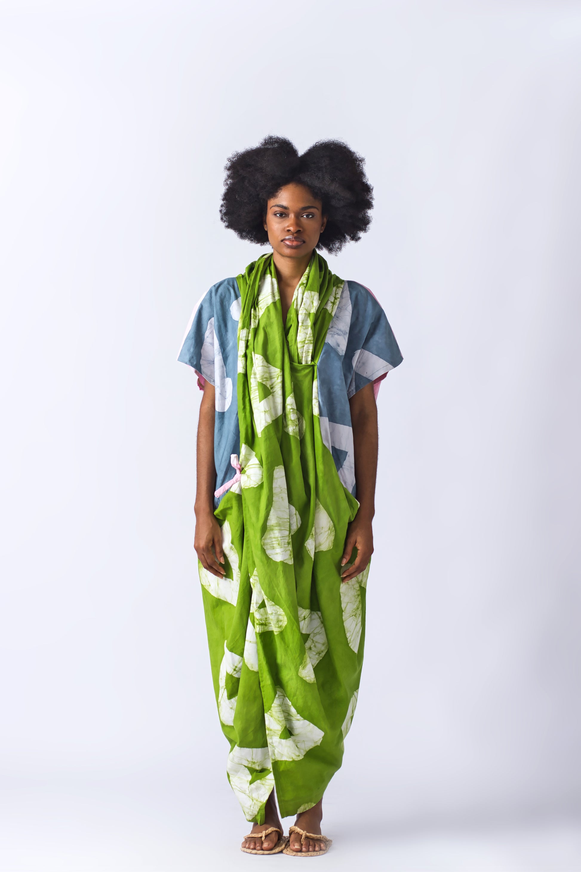 Get cozy with our earthy grey and green kaftan. Featuring dyed triangle prints, this simple yet stylish piece is perfect for those who love the outdoors. Step out in comfort and confidence with this effortless, natural look.