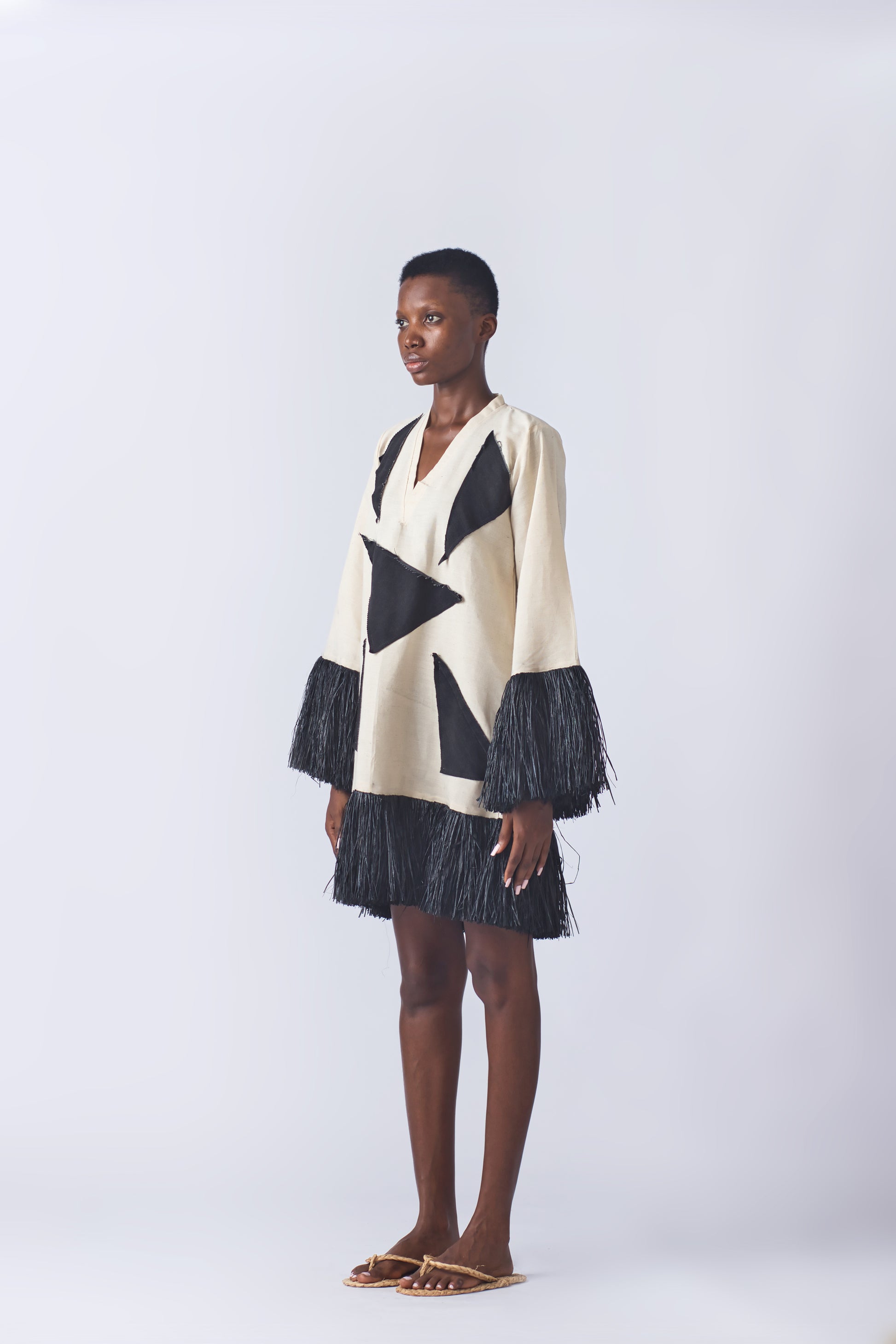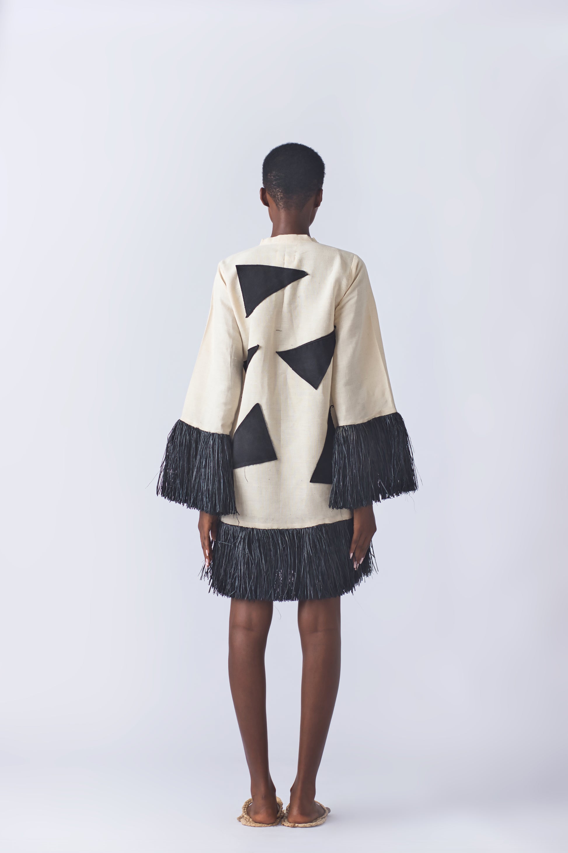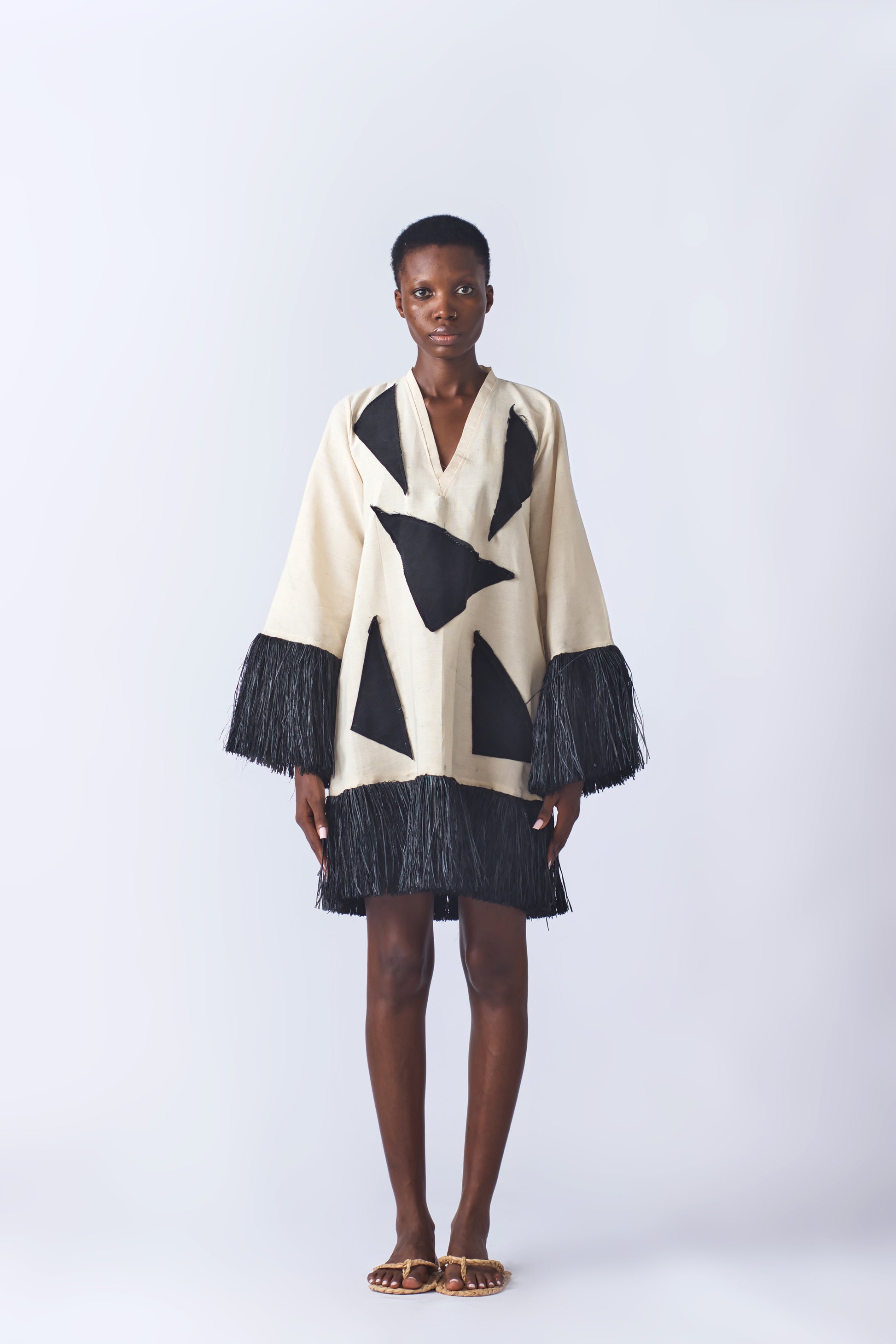 This charming Patched mini dress, featuring a black dyed raffia hem, is a standout piece from the Memory Jean Collection.