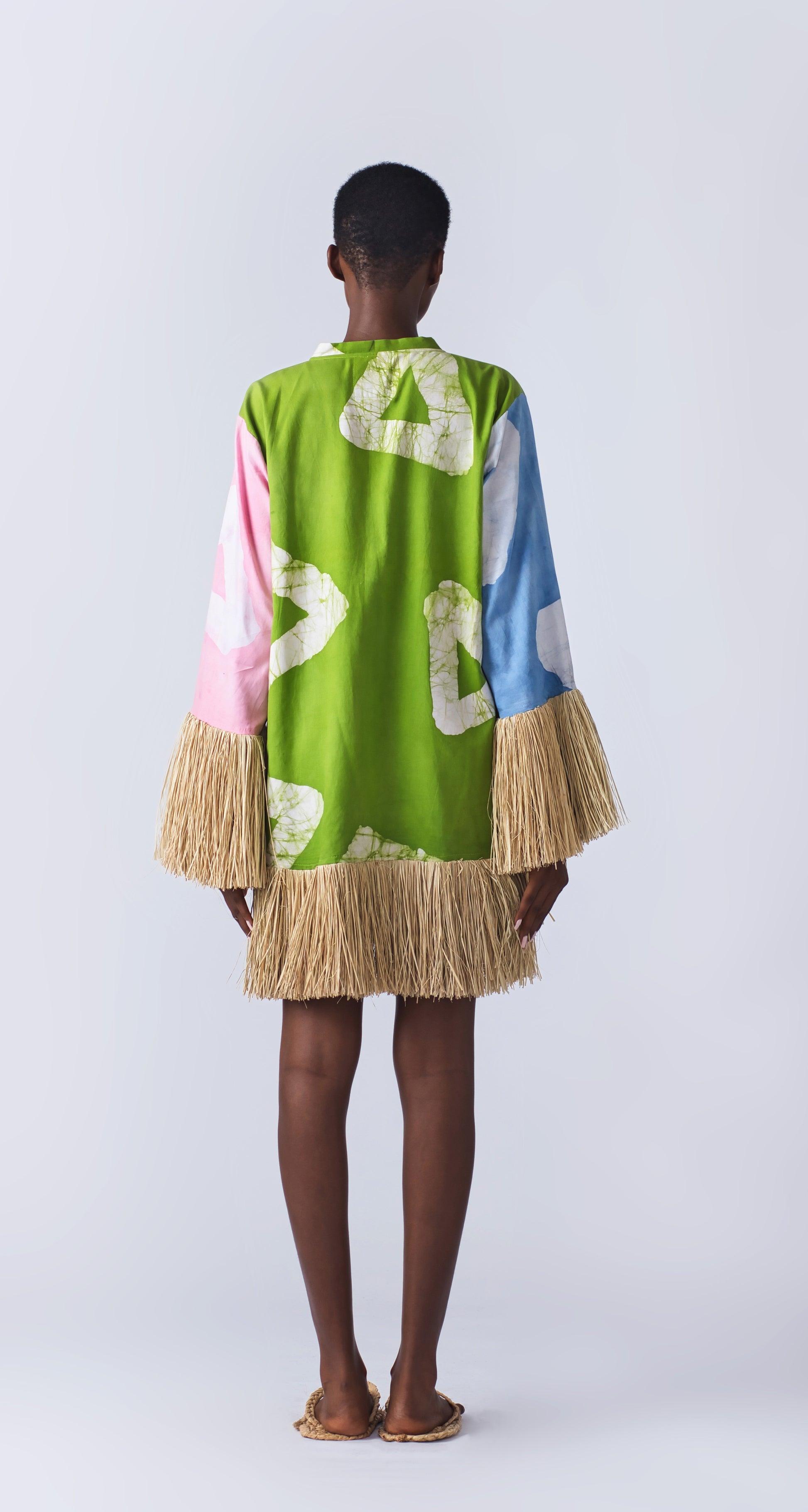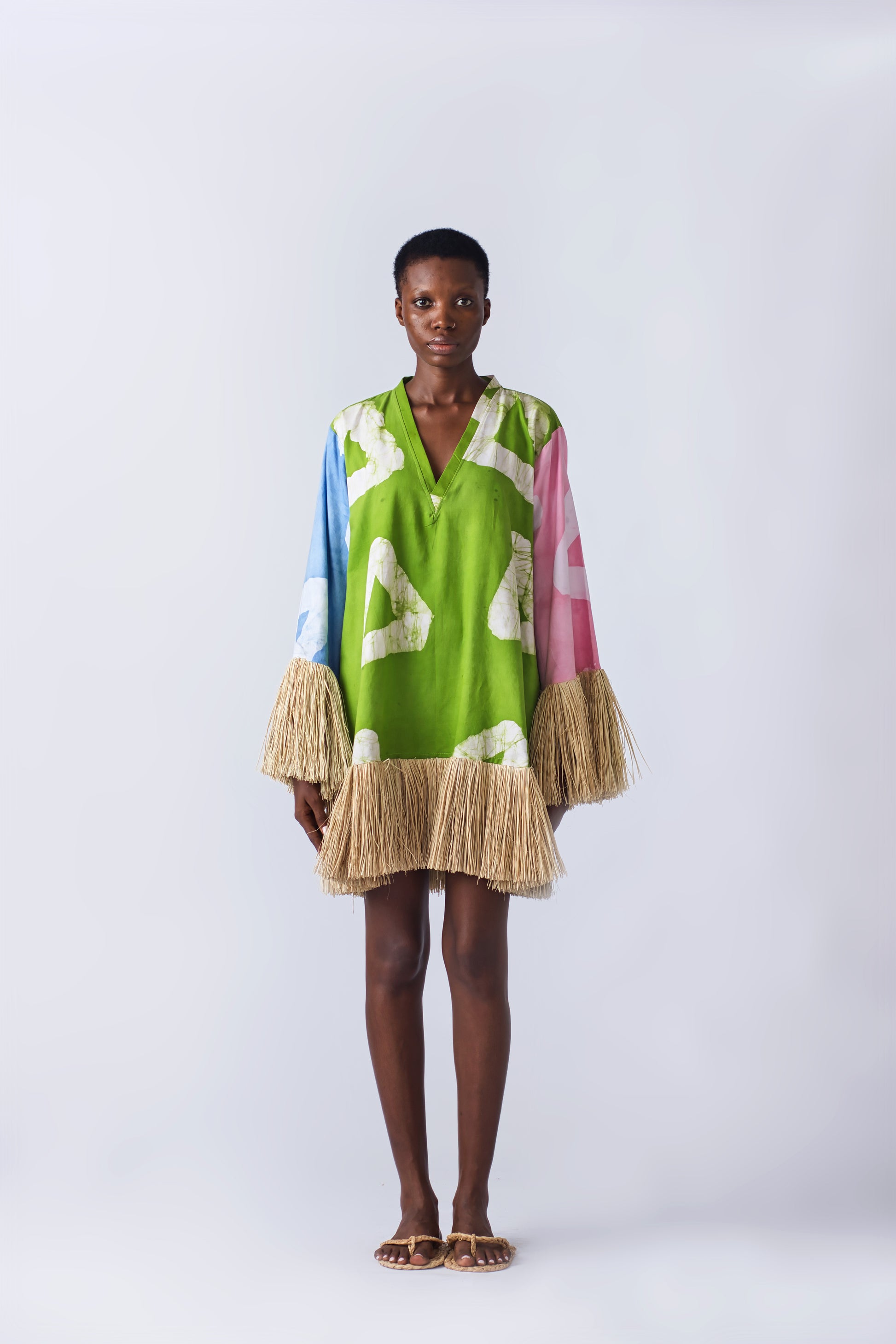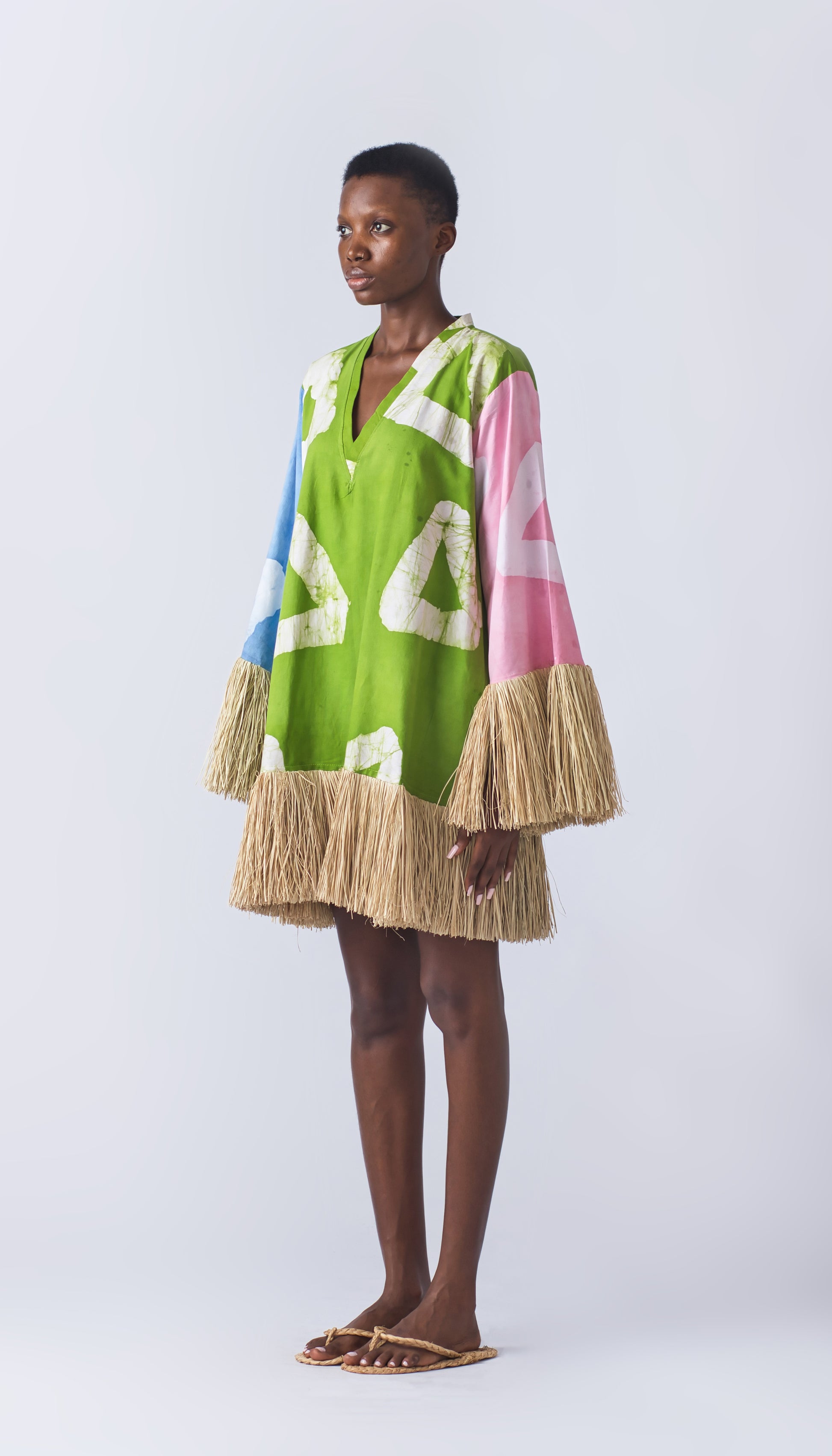 The natural raffia on the hem and sleeves is the edge you need to stand out wherever you choose to go. Available in multiple colours, this V-collar mini dress can go from simple to sophisticated as you accessorize.