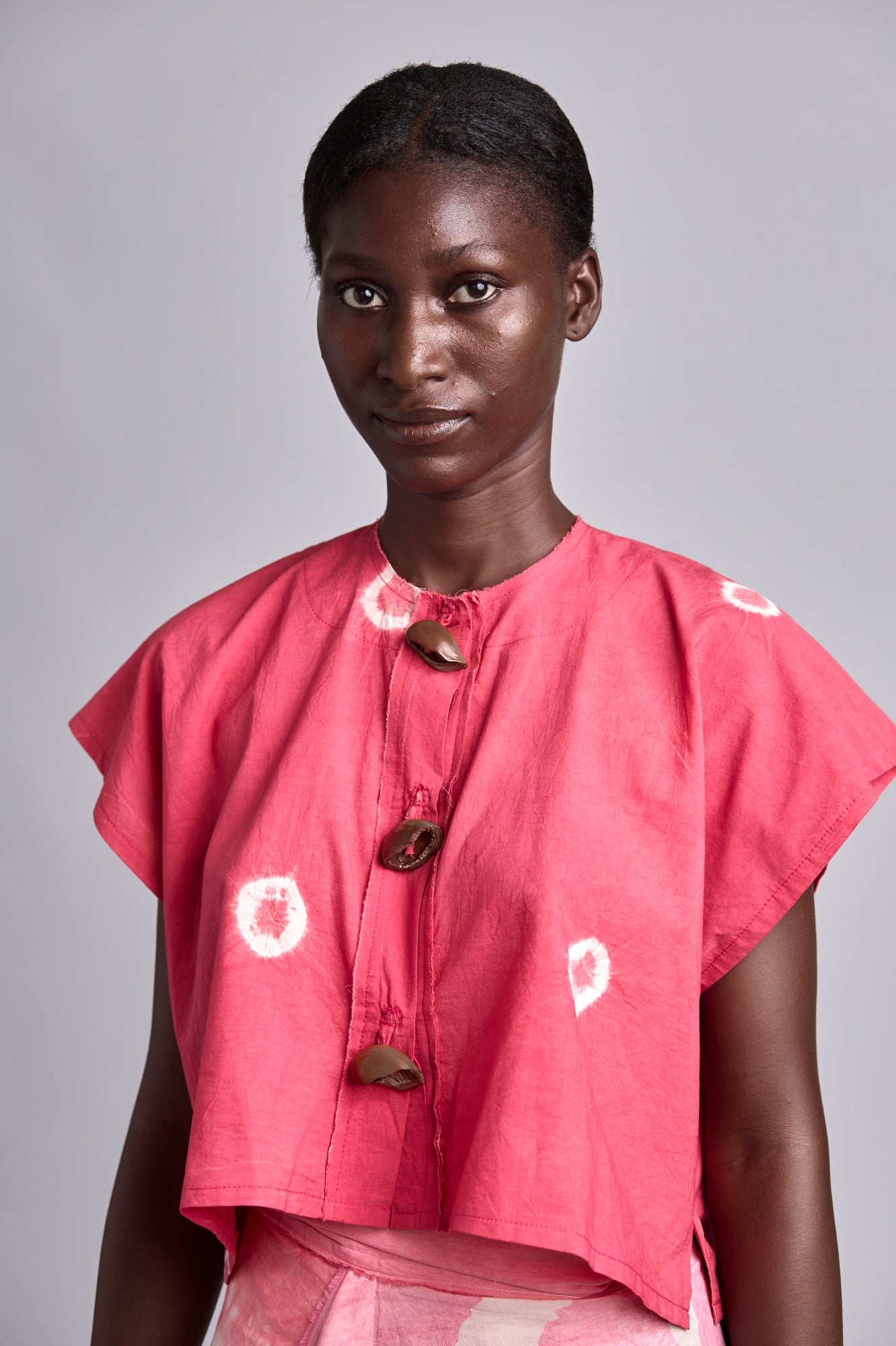 - Classic collar and button-front closure with local seeds buttons