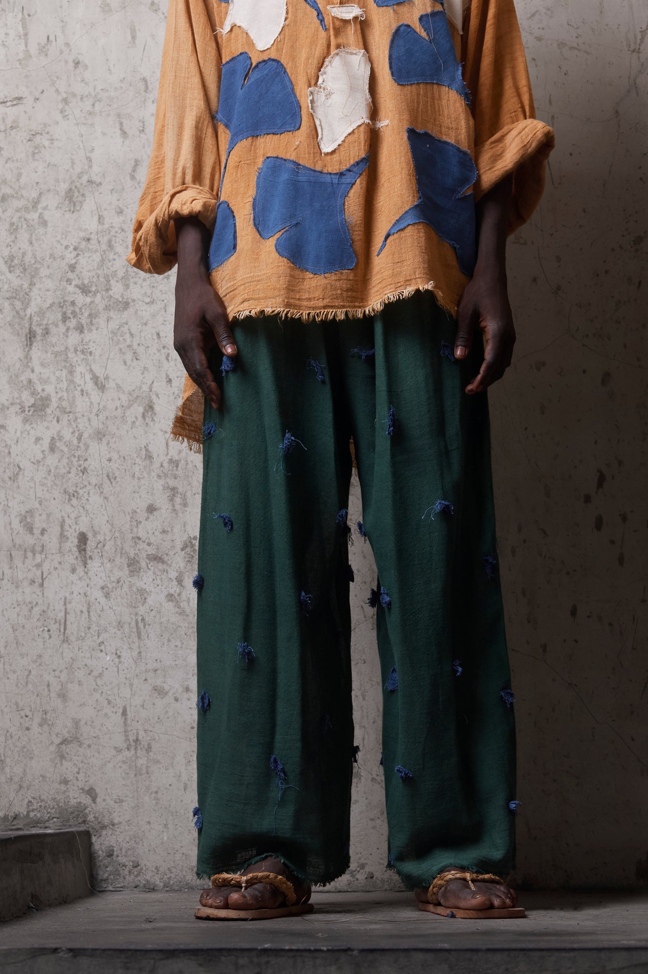 These pants are hand-dyed and finished with patchwork made from leftover studio fabric. The surface pattern reimagines traditional batik—offering the same visual depth and rhythm of print, without wax or paraffin.