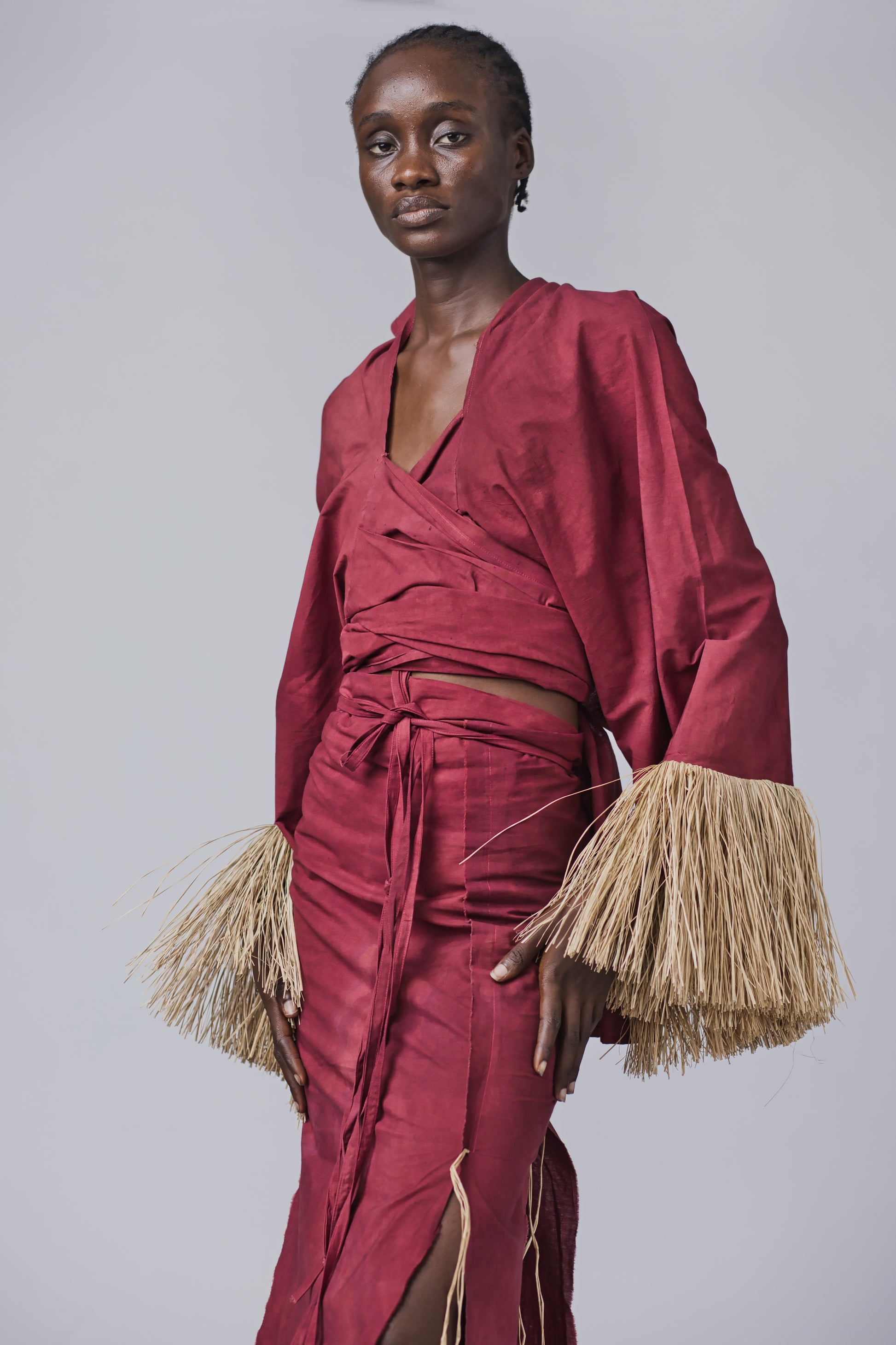 Add a touch of earthy elegance to your wardrobe with our deep dyed wrapped top, complete with raffia trims on sleeves.