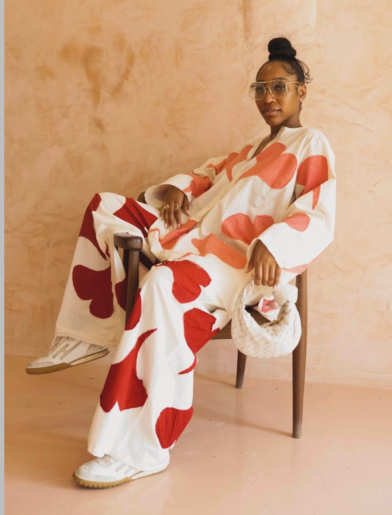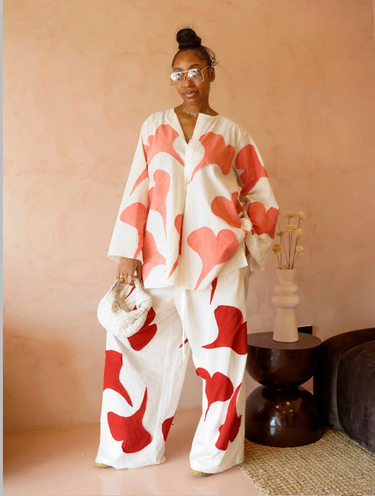 Cut with a generous wide leg, the pant allows the fabric to flow naturally, creating a sense of freedom in motion while maintaining a grounded, architectural presence. Love patches are thoughtfully placed across the fabric as tactile symbols of warmth and connection, transforming the garment into a subtle narrative of care and belonging.